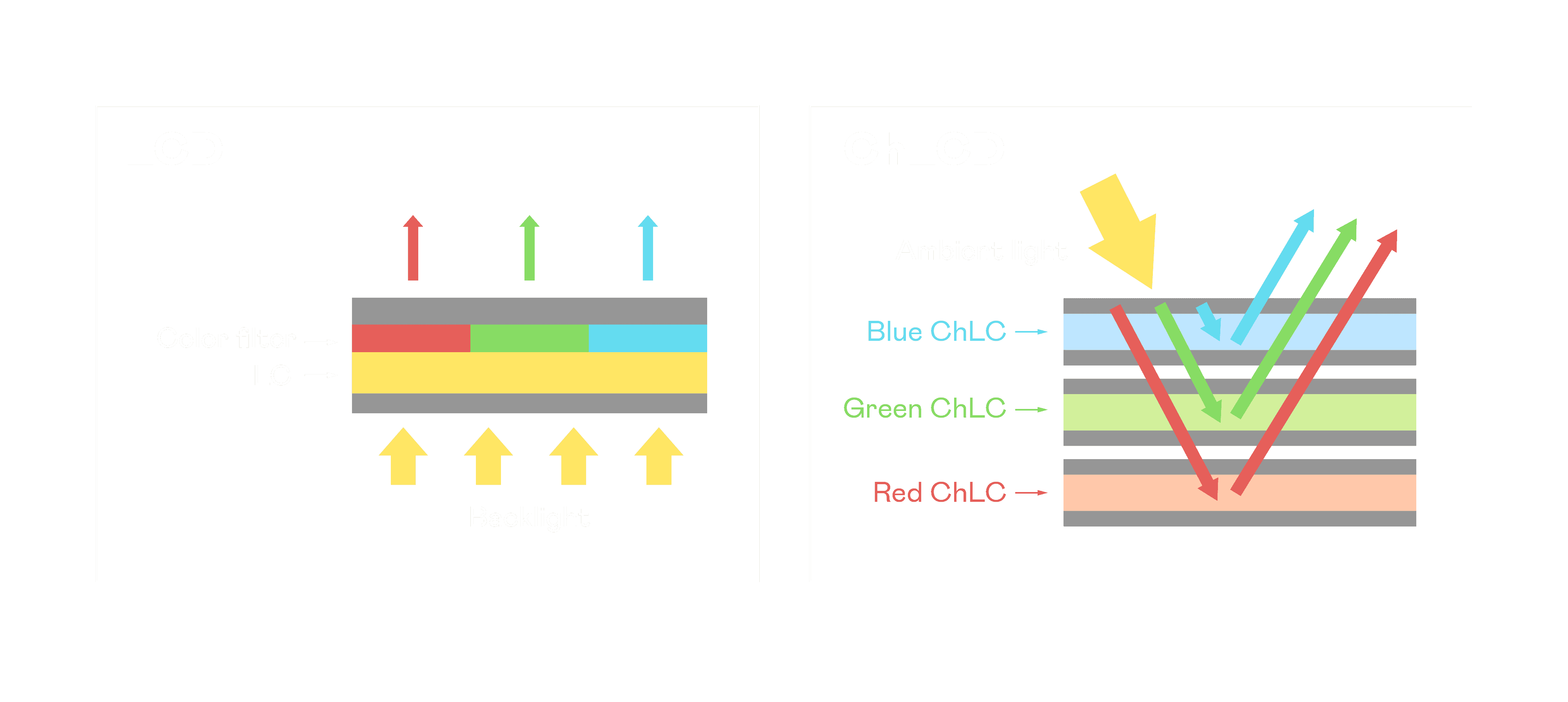 ChLCD 胆固醇液晶就如同纸张一样,,,透过反射环境光来显示影像,,因此长时间观看不易造成人眼视觉疲劳,,,可达到护眼效果。。。当处于户外阳光下使用,,LCD 影像容易失真而不易观看,,,但胆固醇液晶仍可维持较佳的影像品质。。
