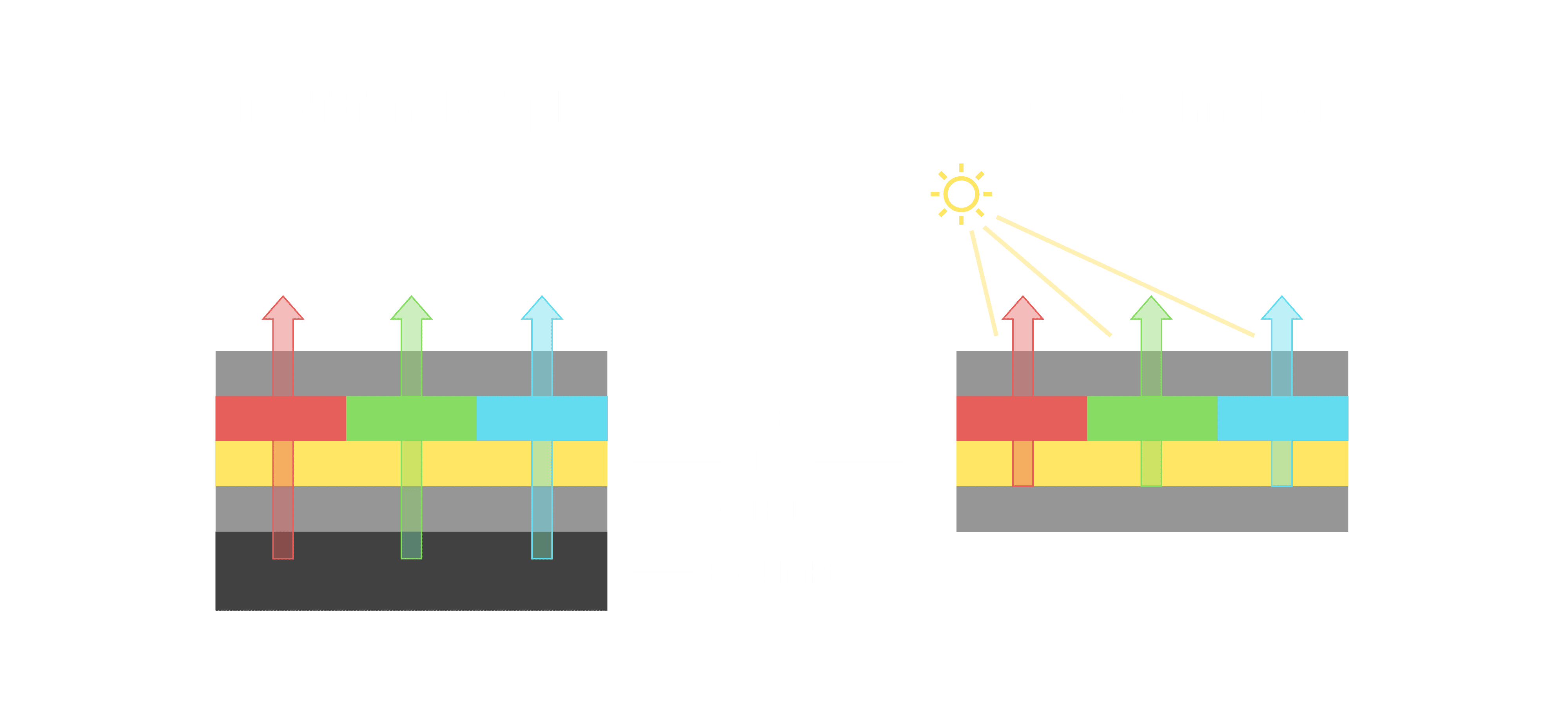 与传统需搭配背光单元的液晶显示相比,,,,反射式液晶技术不仅更省电、、、更轻薄,,且即便在艳阳下仍能清晰显示。。。此外,,少了背光单元,,也大幅降低了 LED 蓝光伤害眼睛的疑虑。。。。