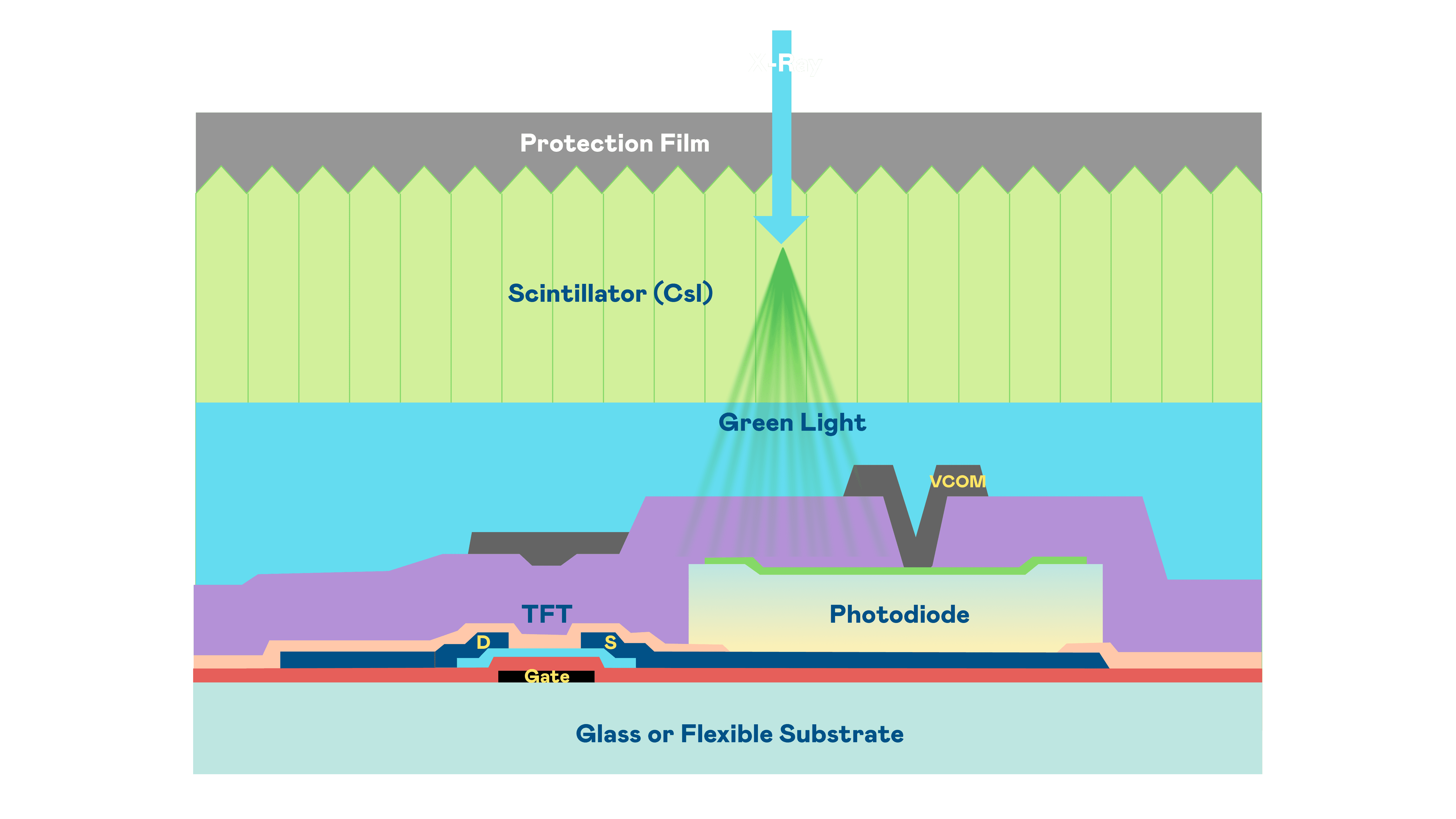 尊时凯龙的X光影像感测阵列使用薄膜电晶体 (TFT) 作为每个像素的读取开关,,,搭配光电二极体(Photodiode)的光电转换元件,,,用以感测X光影像讯号。。。